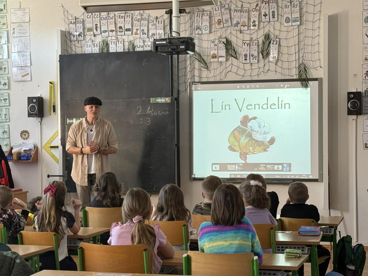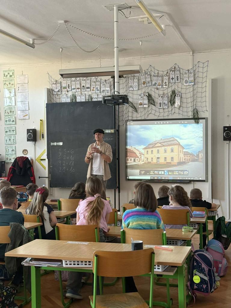 Pan spisovatel nám poutavě vyprávěl o tom, jak vznikají jeho knihy, kde bere inspiraci pro své postavy a jak vypadá práce spisovatele v každodenním životě. Dozvěděli jsme se, že psaní není jen o fantazii, ale také o vytrvalosti, trpělivosti a radosti z tvoření. Žáci se aktivně zapojovali, kladli zvídavé otázky a bylo vidět, že je povídání opravdu baví.
