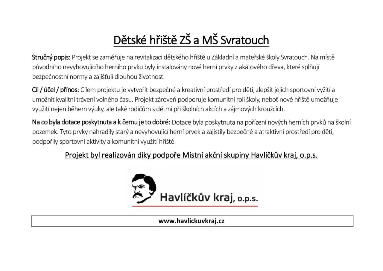 Dotace byla poskytnuta na pořízení nových herních prvků na školní pozemek. Tyto prvky nahradily starý a nevyhovující herní prvek a zajistily bezpečné a atraktivní prostředí pro děti, podpořily sportovní aktivity a komunitní využití hřiště.